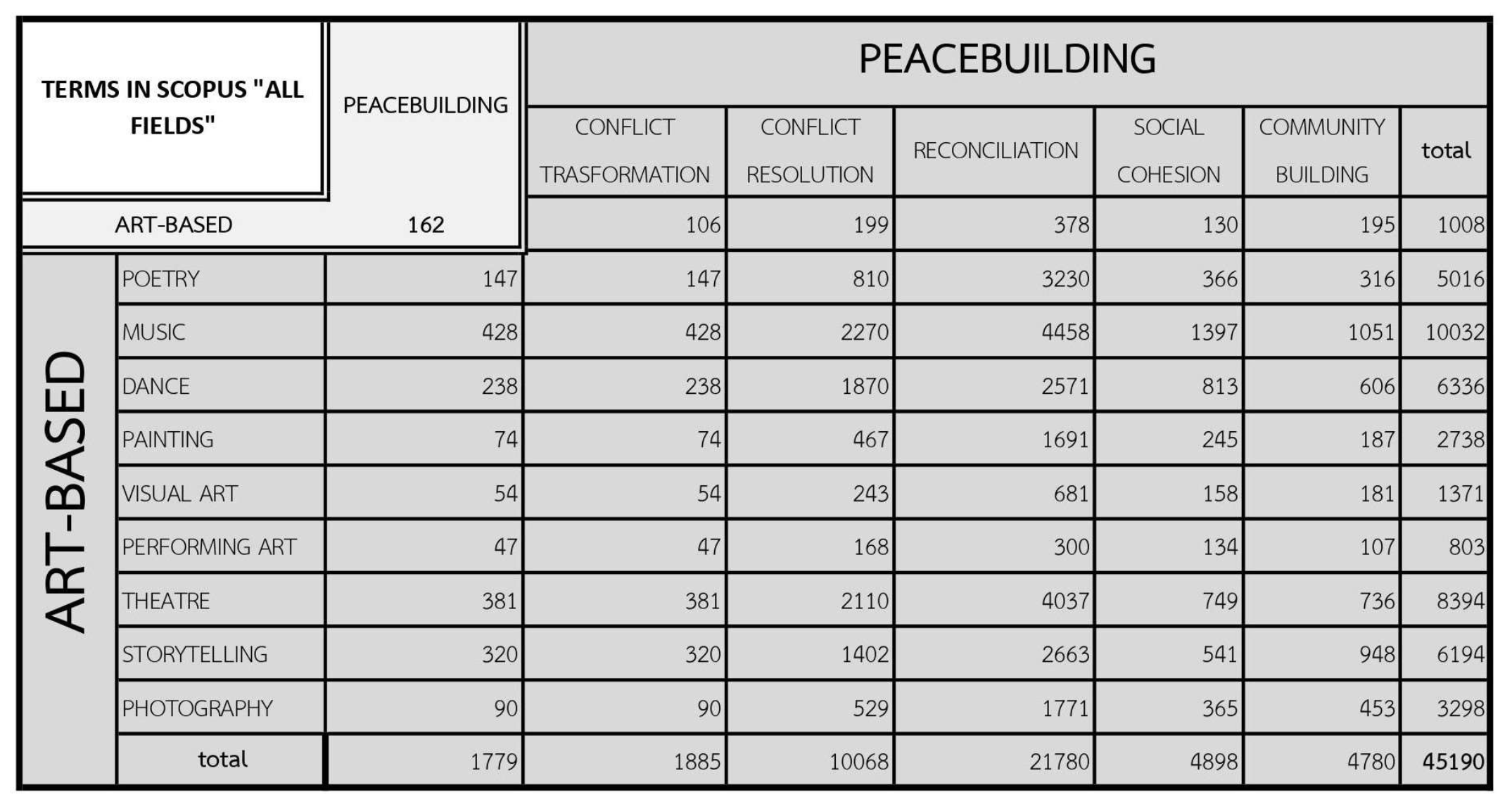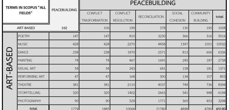 È interessante notare che quando si cercano studi su SCOPUS utilizzando i termini “art-based” e “peacebuilding”, i risultati mostrano solo 162 studi (fino a luglio 2023). Tuttavia, incrociando i riferimenti con termini correlati, c’è un potenziale di 45.190 studi.